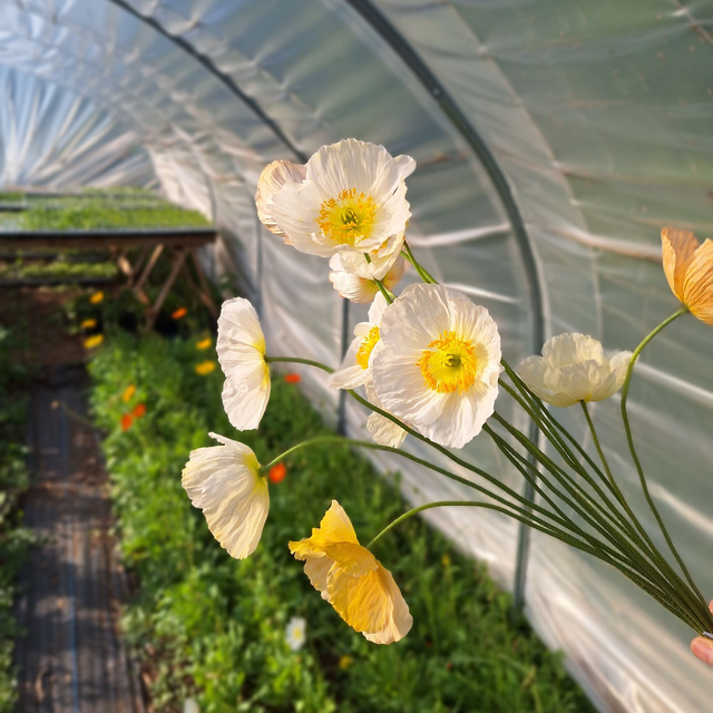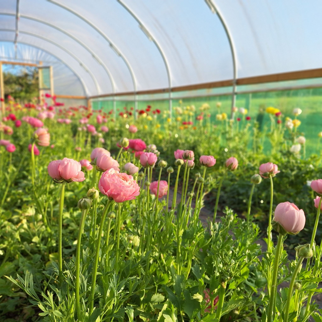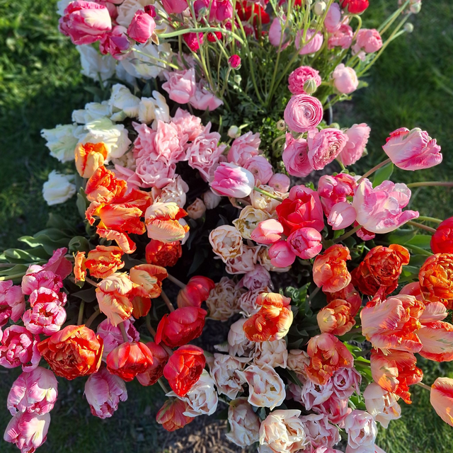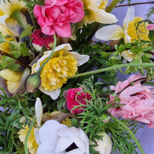 A seasonal hand-tied bouquet featuring the very best seasonal stems from the farm. Including premium stems of ranunculus, striking anemones, and specialty tulips, all nestled in a textured mix of fresh foliage, in a colour mix perfect for Mother's Day. A true celebration of the season's first delights.